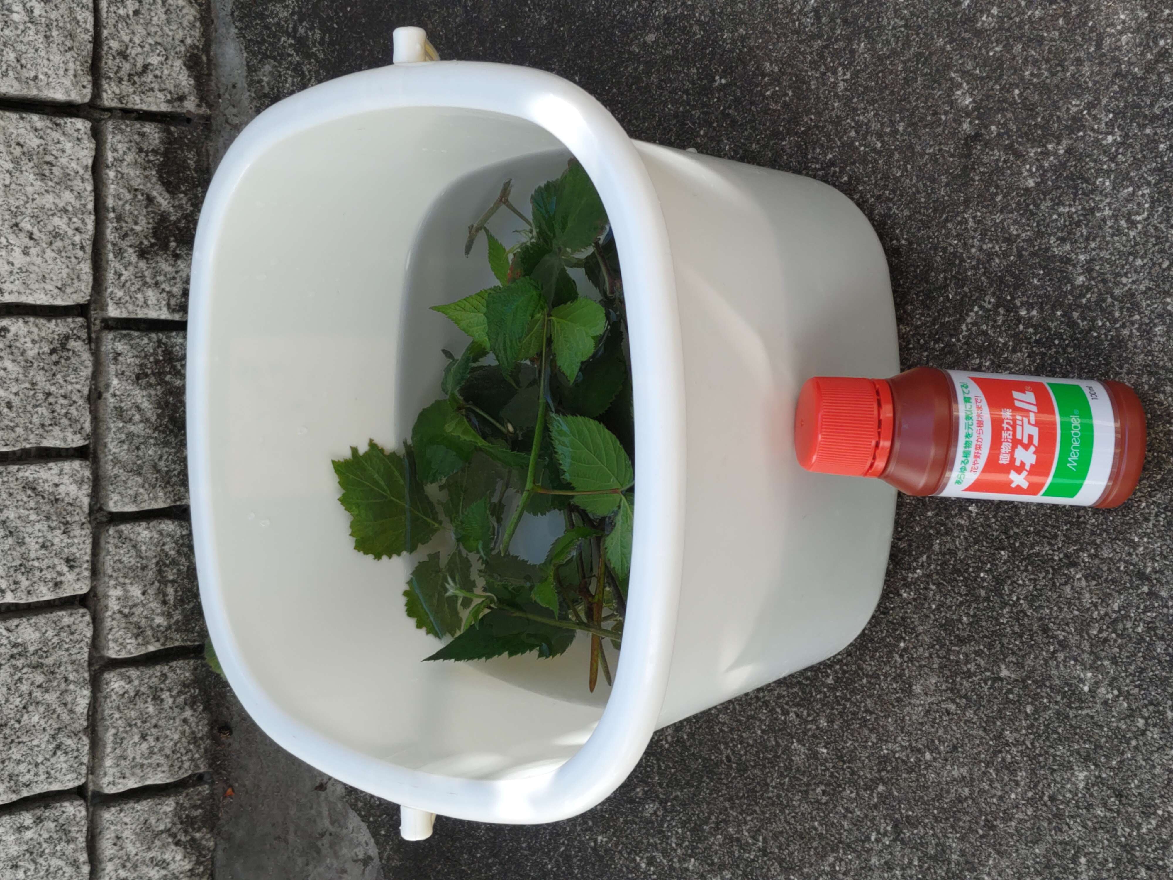 ②はつ根ホルモン剤1DLと、1Lの水をバケツに入れ、挿し木を2時間程度しっかりと浸します。