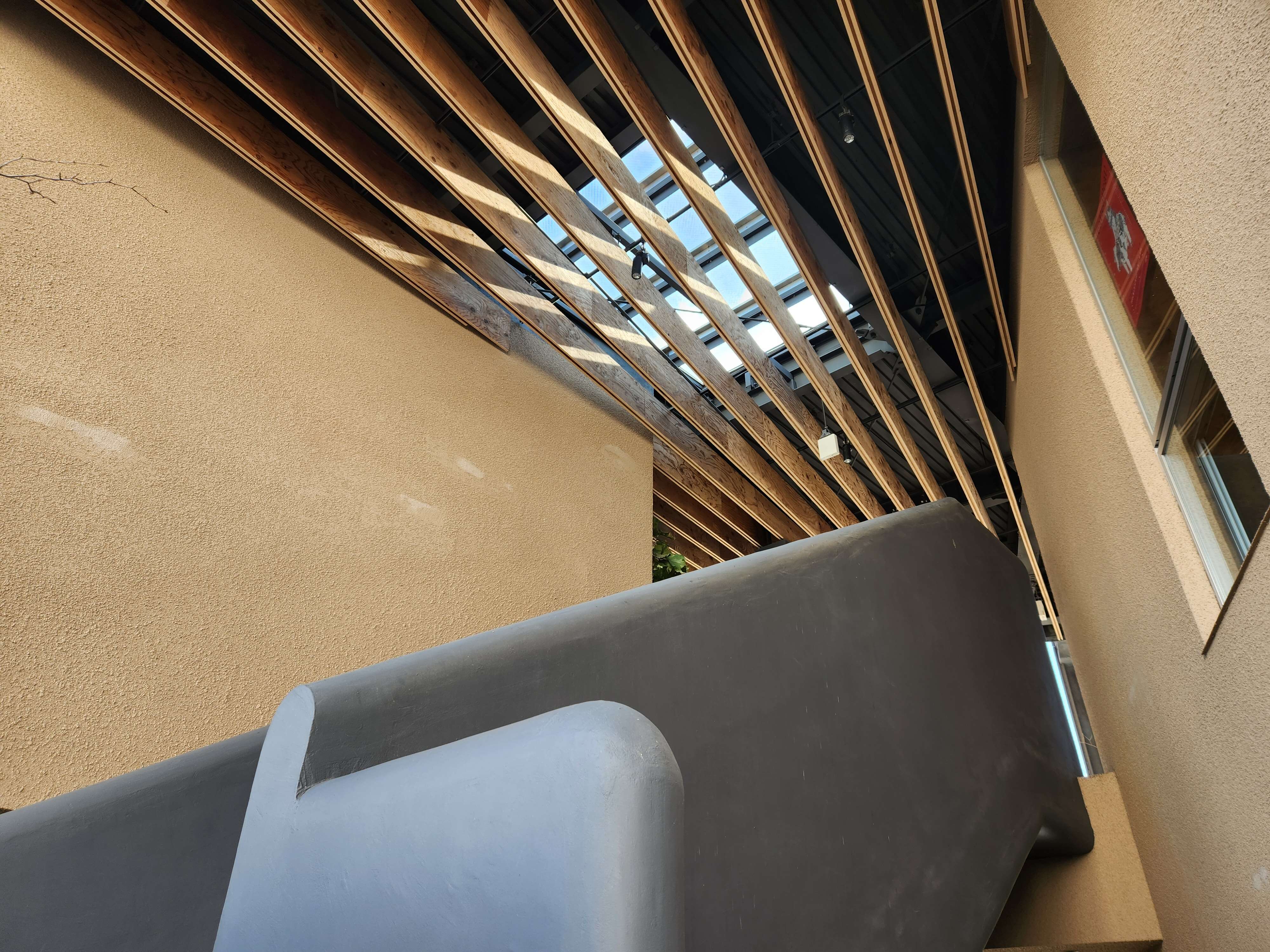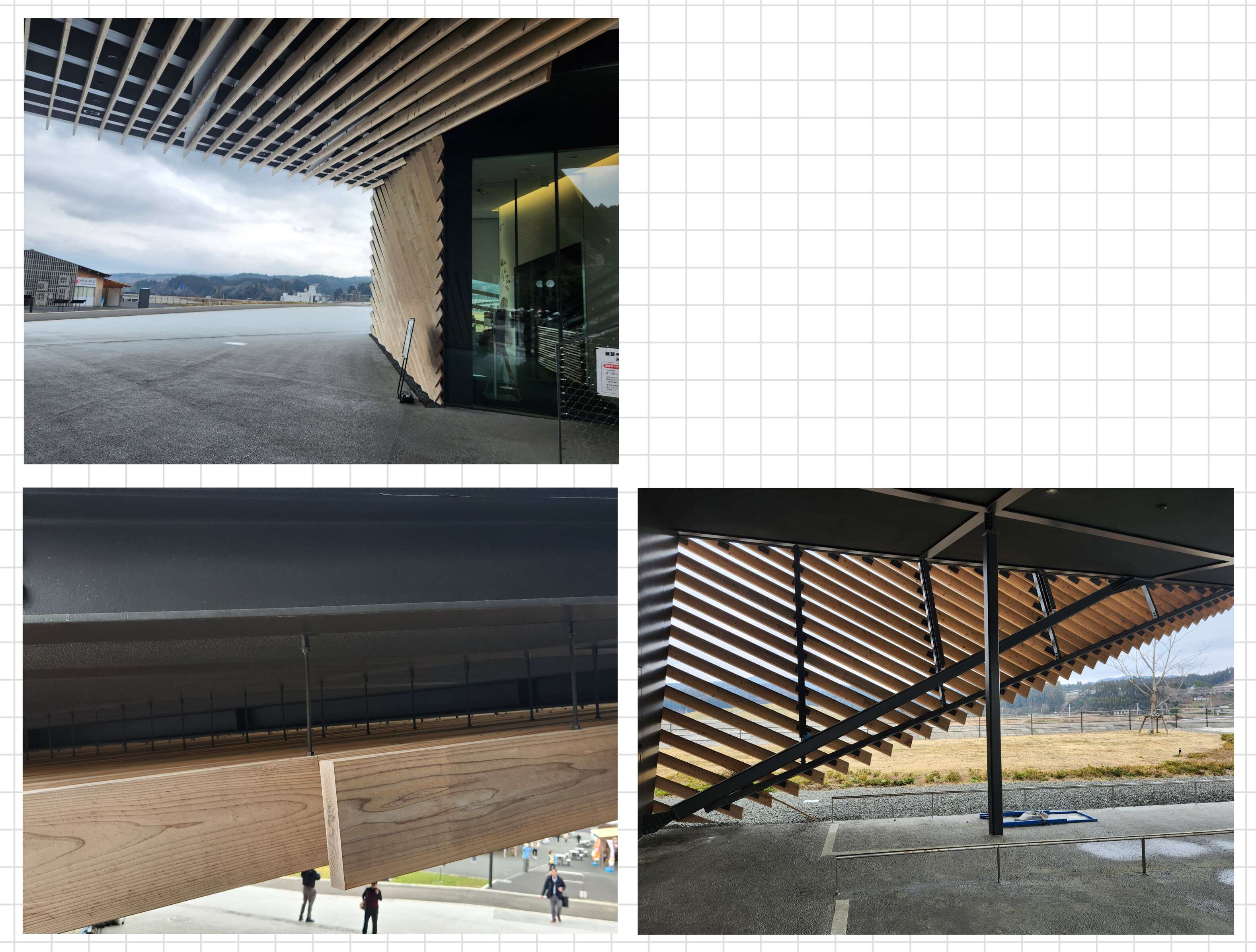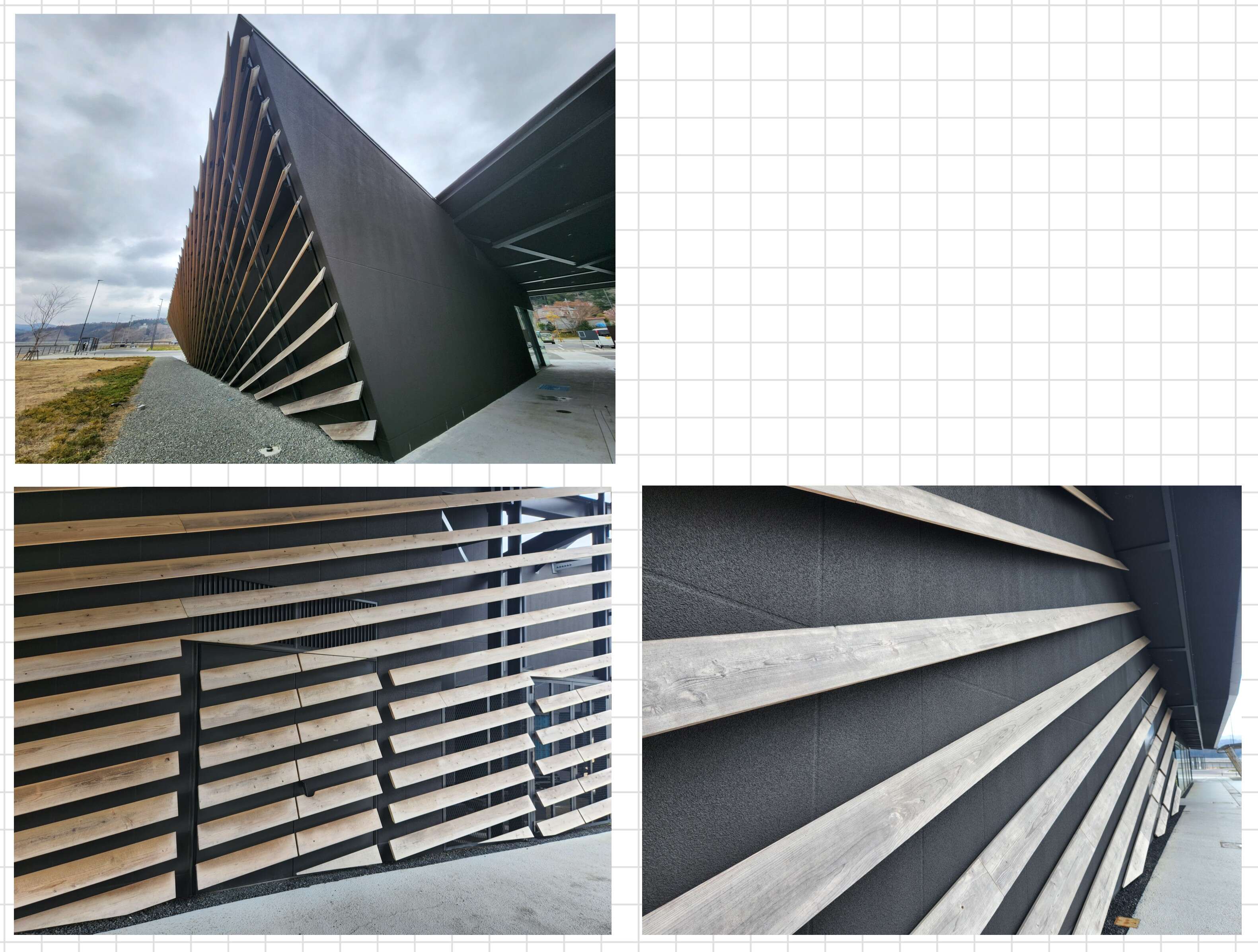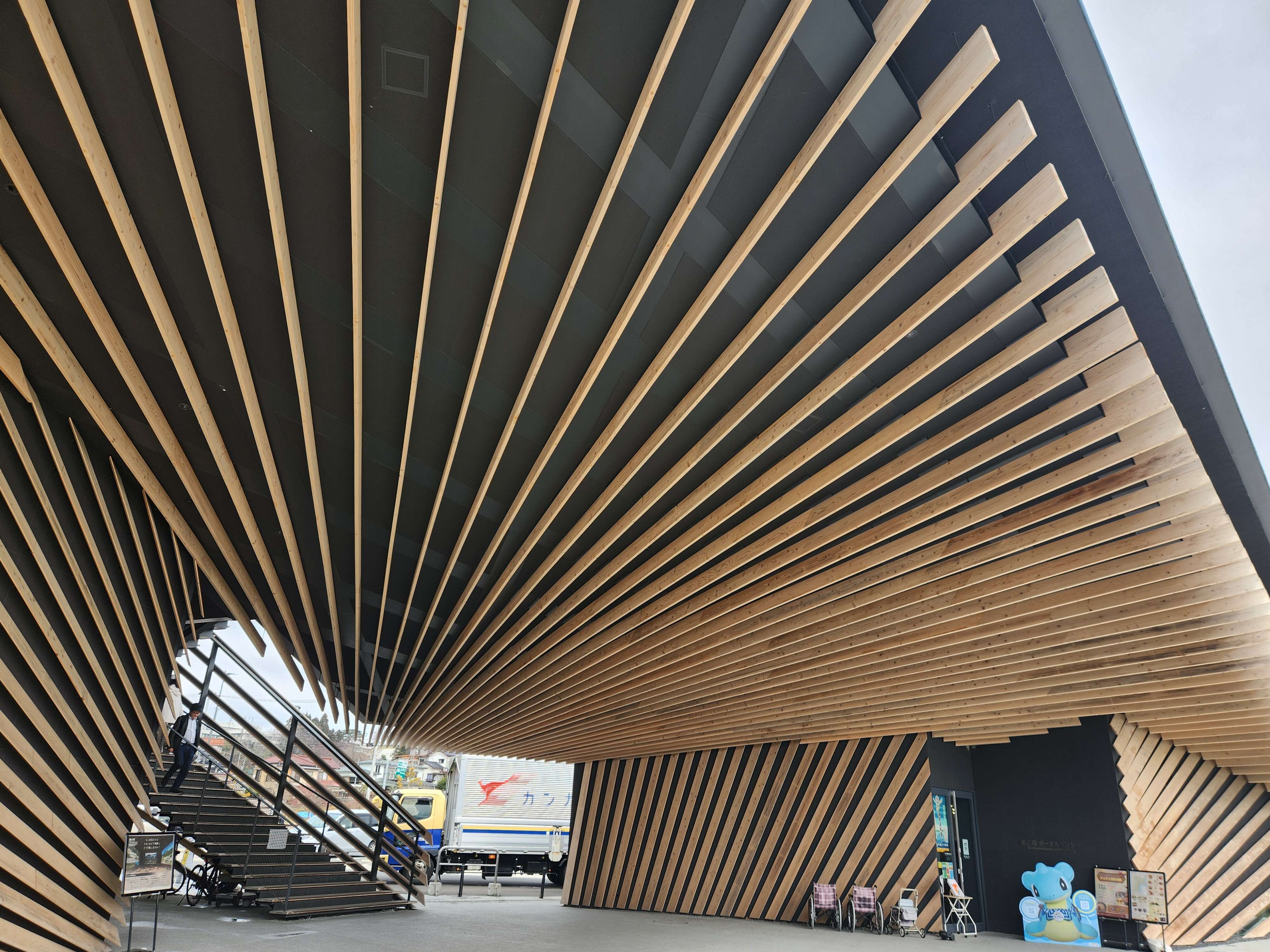 このゲートの外壁は、南三陸の杉でできたルーバーで覆われています。
