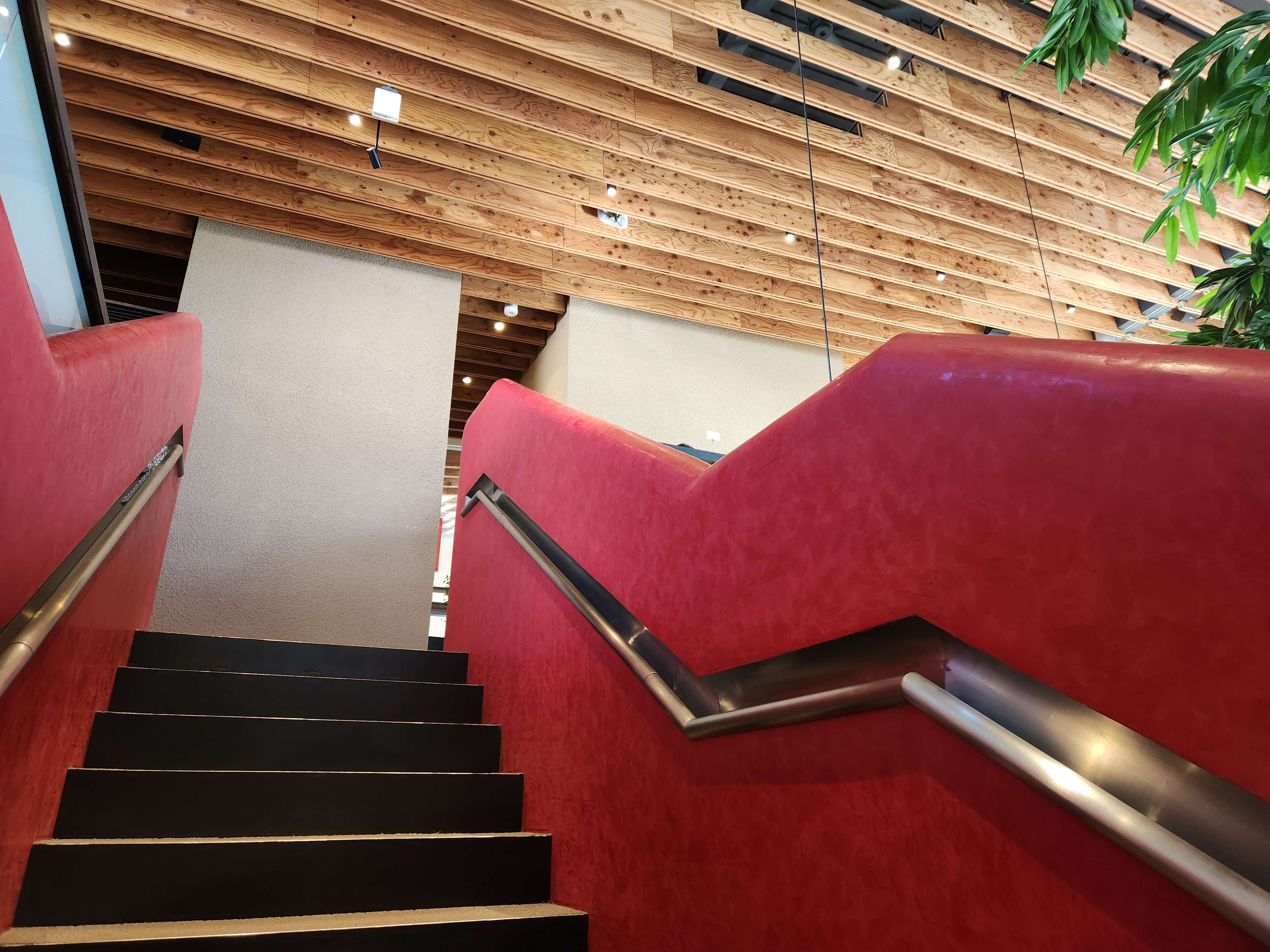 建物の中に入るとまず目に入る天井のルーバーは、トップライトからの光が木漏れ日となって外部のような空間をつくり出しているとのことです。