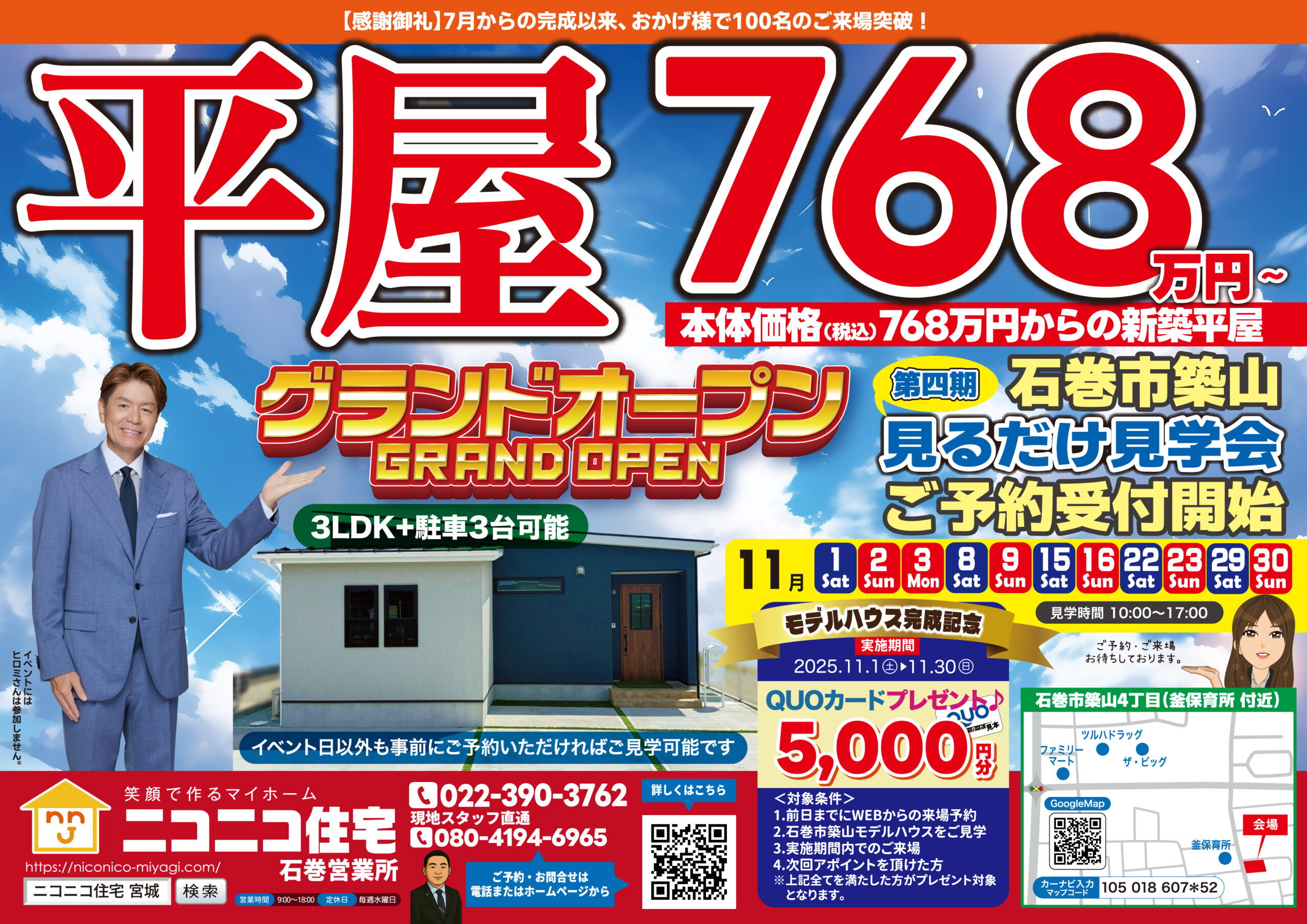 石巻市築山の平屋モデルハウス見学会を開催します。