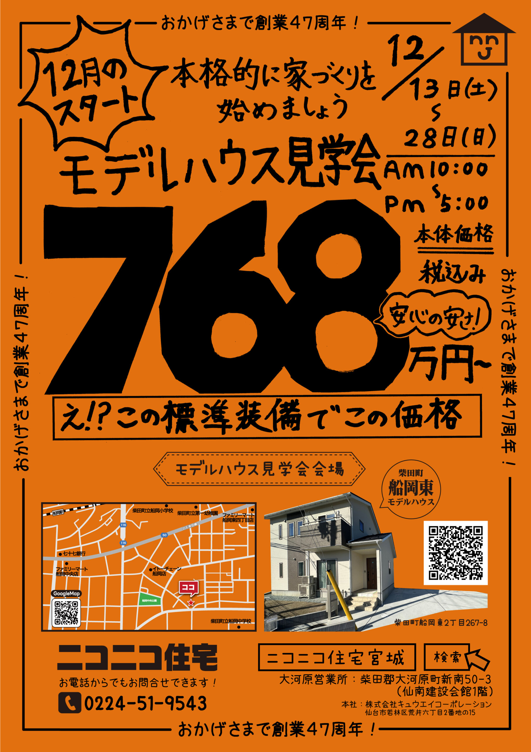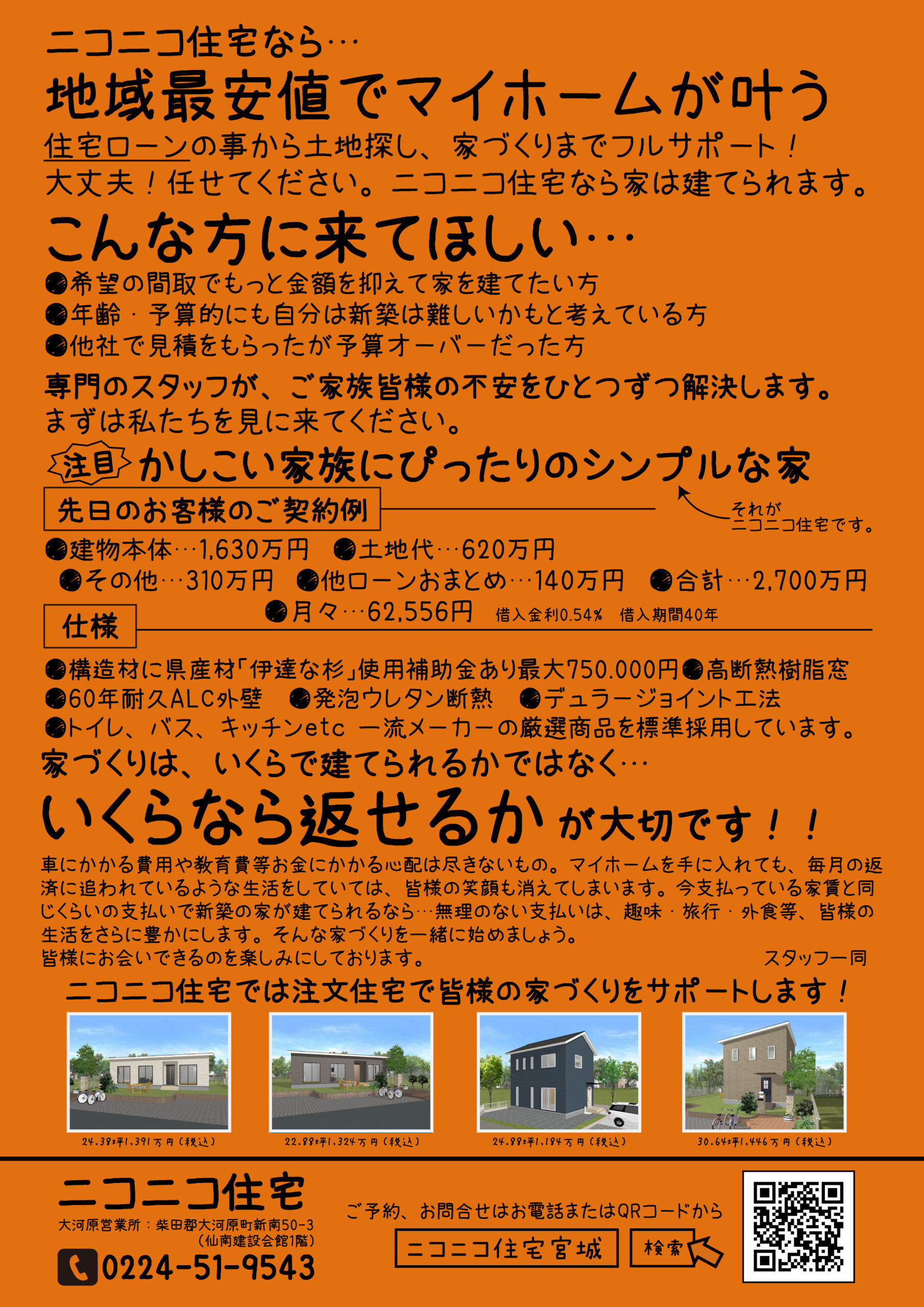 柴田町船岡東モデルハウス(3LDK 駐車スペース2台)の見学会を開催します。 超ローコスト住宅専門店の「高品質・低価格」の家を体感してみませんか?