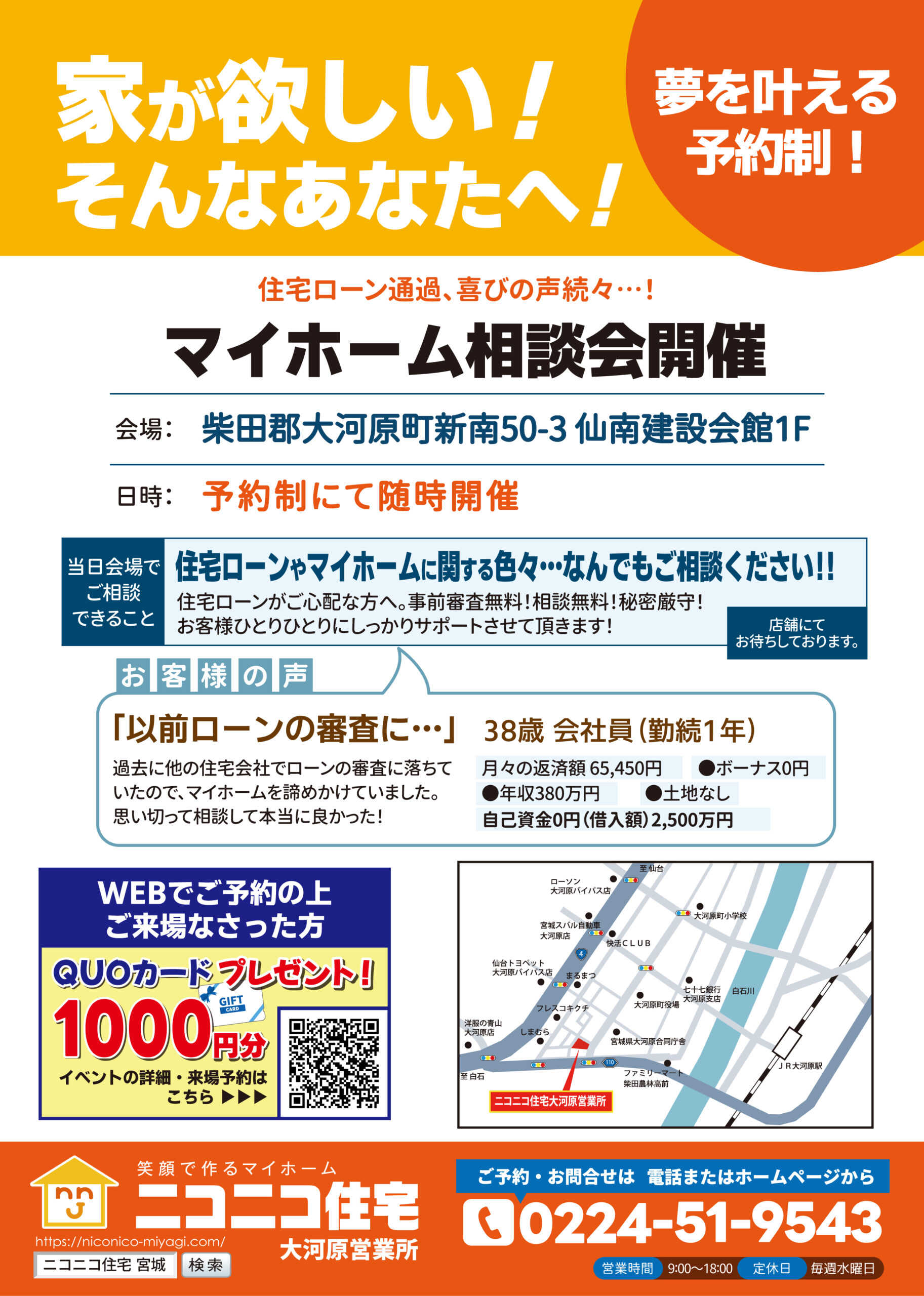 大河原町にて新築マイホーム相談会を開催します。 どうぞお気軽にご相談ください。 場所は仙台法務局大河原支局から南へすぐ! ぜひお越しください。